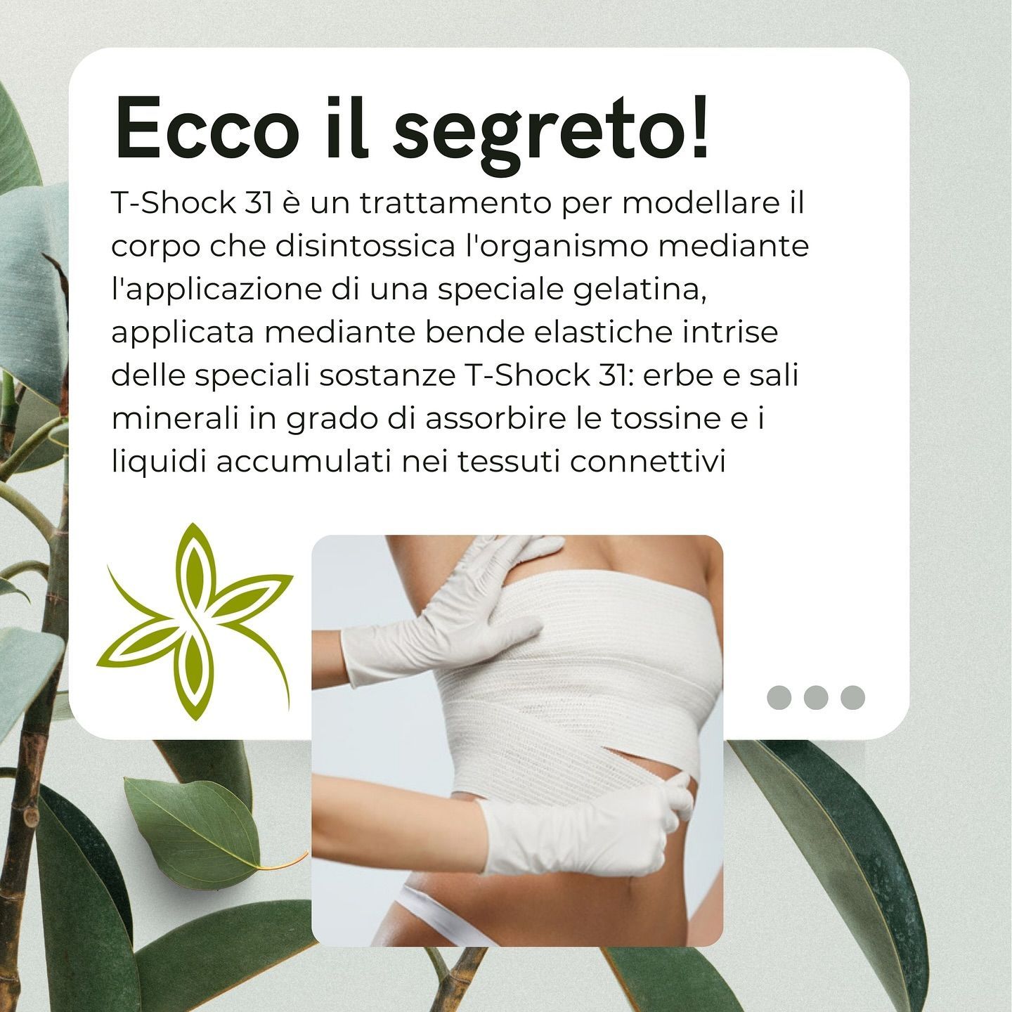 Il cuore del programma T-Shock 31 è una speciale gelatina composta da 31 piante officinali, combinata con le bende a compressione graduata i imbevute in una miscela di sali marini.